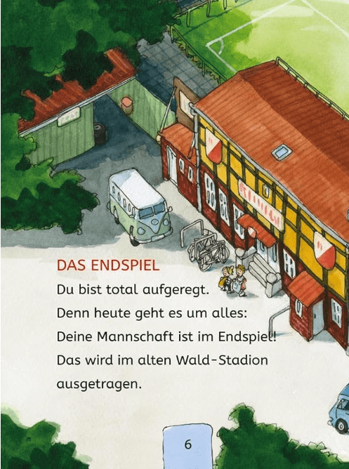 Dieses Erstlesebuch nutzt einen cleveren Motivationskniff: Das Kind ist nicht Zuschauer, sondern Teil der Mannschaft („Du bist neu im Team“). Die Ausgangslage ist sofort klar und emotional: Ein fieser Spieler aus dem gegnerischen Team sperrt die Kinder ein – und plötzlich steht mehr auf dem Spiel als „nur“ Lesen: Rauskommen, rechtzeitig aufs Feld, das Spiel retten.