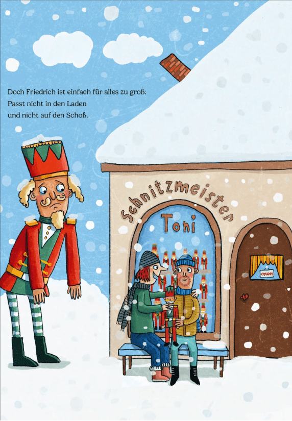 Denn Friedrich ist zu Beginn alles andere als glücklich. Er ist das Meisterwerk eines bayerischen Schnitzers – riesig, prachtvoll, besonders. Doch er passt nirgends hinein: nicht in den Laden, nicht auf den Schoß, nicht in ein Zuhause. Noch schlimmer: Er hat eine Nussallergie. Für einen Nussknacker ein ziemliches Drama.