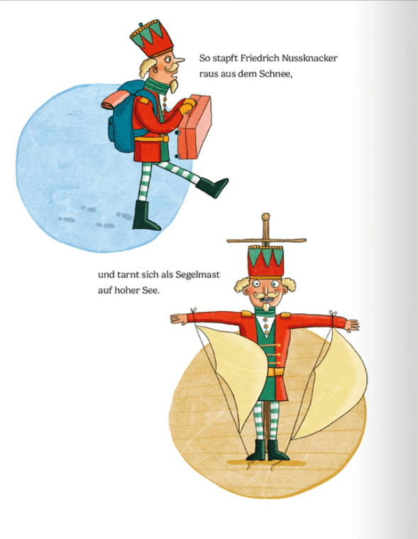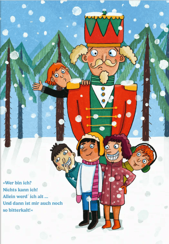 Vielleicht habt ihr ihn auch schon gesehen: Friedrich, den riesigen Nussknacker mit der Zahnlücke, der Kokosnüsse in die Luft wirft und dabei zwischen Palmen und Schneeflocken steht. Allein das Cover dieses Bilderbuchs ist schon ein Versprechen – auf Fantasie, Humor und eine Geschichte, die anders ist als die anderen.