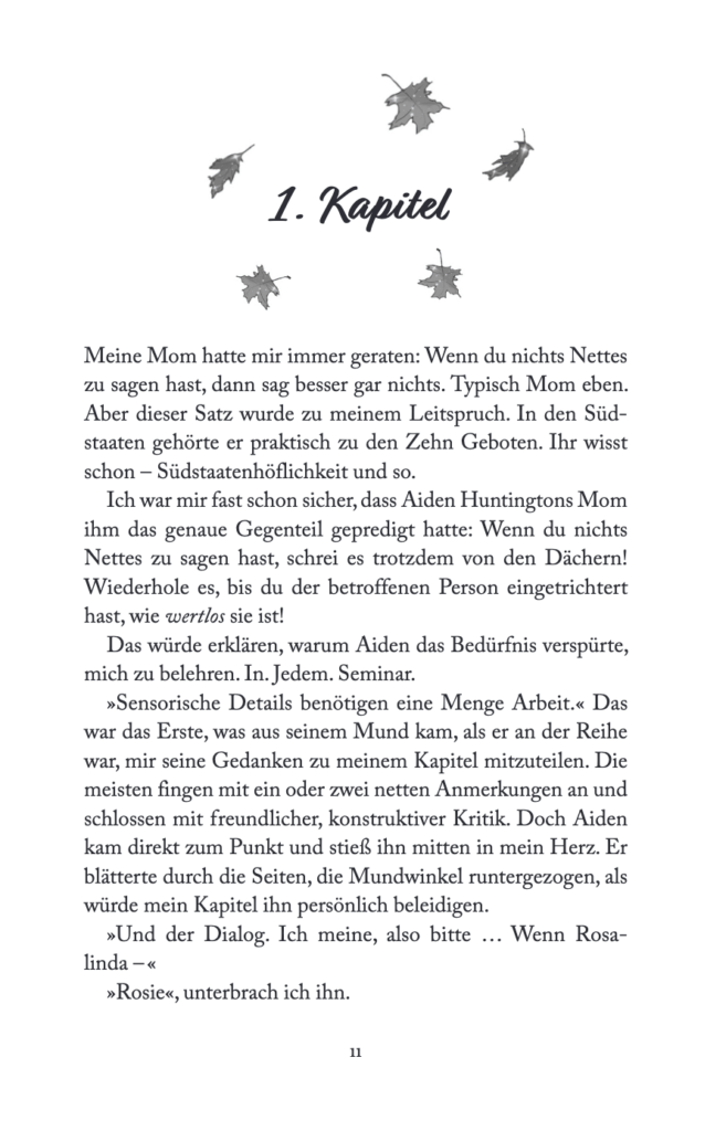 Diese Geschichte überrascht mit spritzigen Dialogen und Sätzen, die man am liebsten rahmen würde. Sie steckt voller starker Gefühle, lebendiger Figuren und diesem gewissen Etwas, das dich doppelt mitfiebern lässt – denn das Buch im Buch ist mehr als nur eine Spielerei. Alles daran wirkt intensiv und nah. Wenn du gern hinter Fassaden schaust, wenn du es liebst, das langsame Aufbrechen von Vorurteilen mitzuerleben, dann wirst du Rosie und Aiden ins Herz schließen. Und wenn du Book Nerd bist und Geschichten über Geschichten liebst – dann ist dieses Buch wie für dich gemacht.