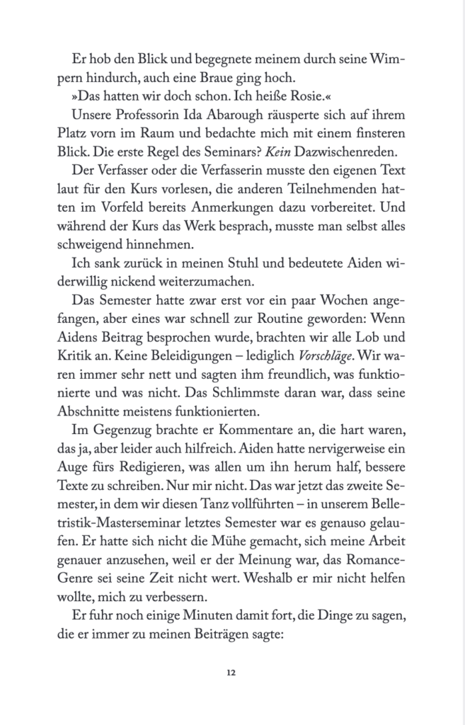 Katie Holt gelingt mit ihrem Debüt etwas Besonderes: Sie verwebt eine feurige Enemies-to-Lovers-Romance mit einem leidenschaftlichen Blick auf das Schreiben selbst. Rosie schreibt Romance. Aiden schreibt gehobene Literatur. Beide treffen in einem Seminar aufeinander – und es fliegen die Fetzen. Doch dort gilt die „Safe-Space“-Regel, und lautstarke Auseinandersetzungen unter der Gürtellinie sind absolut tabu. Da Rosie und Aiden immer wieder die Beherrschung verlieren, wird ihnen ein Ultimatum gestellt: Entweder sie schreiben gemeinsam ein Buch – oder sie fliegen aus dem Seminar.