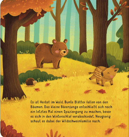 Die feinen Illustrationen sind bewusst reduziert – sie laden zum gemeinsamen Entdecken ein, ohne zu überfordern. Wo wächst ein Pilz? Wer versteckt sich da im Laub? So entstehen Gespräche, ganz nebenbei wächst der Wortschatz, und die Kinder lernen, genau hinzuhören und hinzusehen.