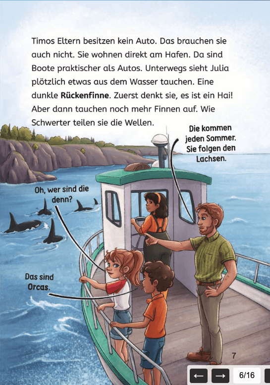 Es fühlt sich an, als wärst du mit Julia in den Ferien unterwegs – fern von zu Hause, ganz nah am Wasser und mitten unter Walen. Und das alles mit so wenig Text – aber so viel Atmosphäre! Es ist wirklich beeindruckend, wie spannend und lehrreich eine Geschichte sein kann, die trotzdem leicht zu lesen ist.