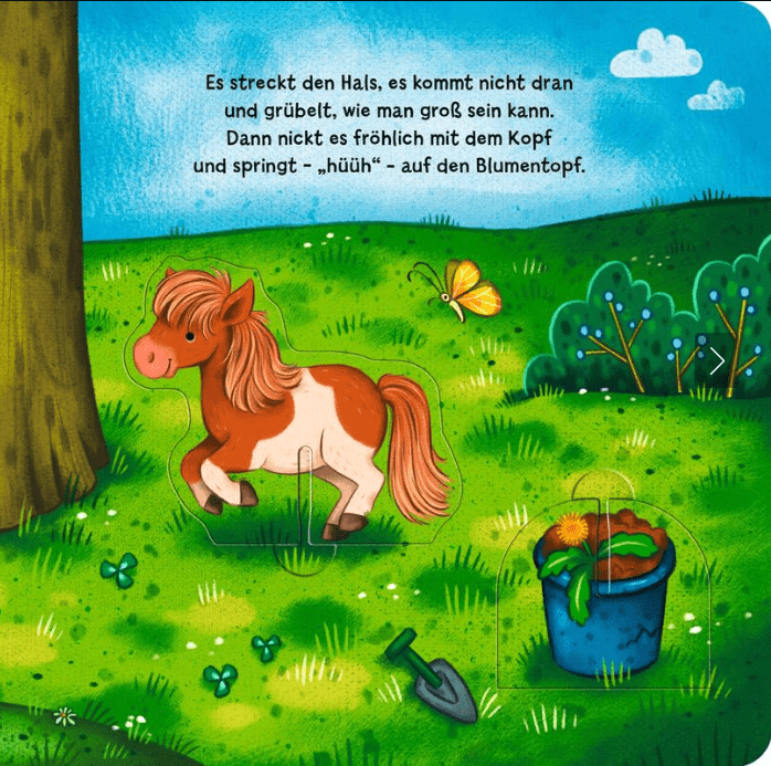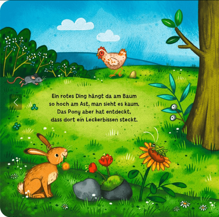 Das Pony hat etwas Schönes hoch oben im Baum entdeckt. Es duftet und es leuchtet so schön rot, doch das Pony kommt leider nicht bis zum Ast heran. Wer findet mit den Tieren heraus, was sich im Baum versteckt? Wer kann das Schwein auf das Pony stellen, das Schaf auf das Schwein, die Katze auf das Schaf und so weiter?